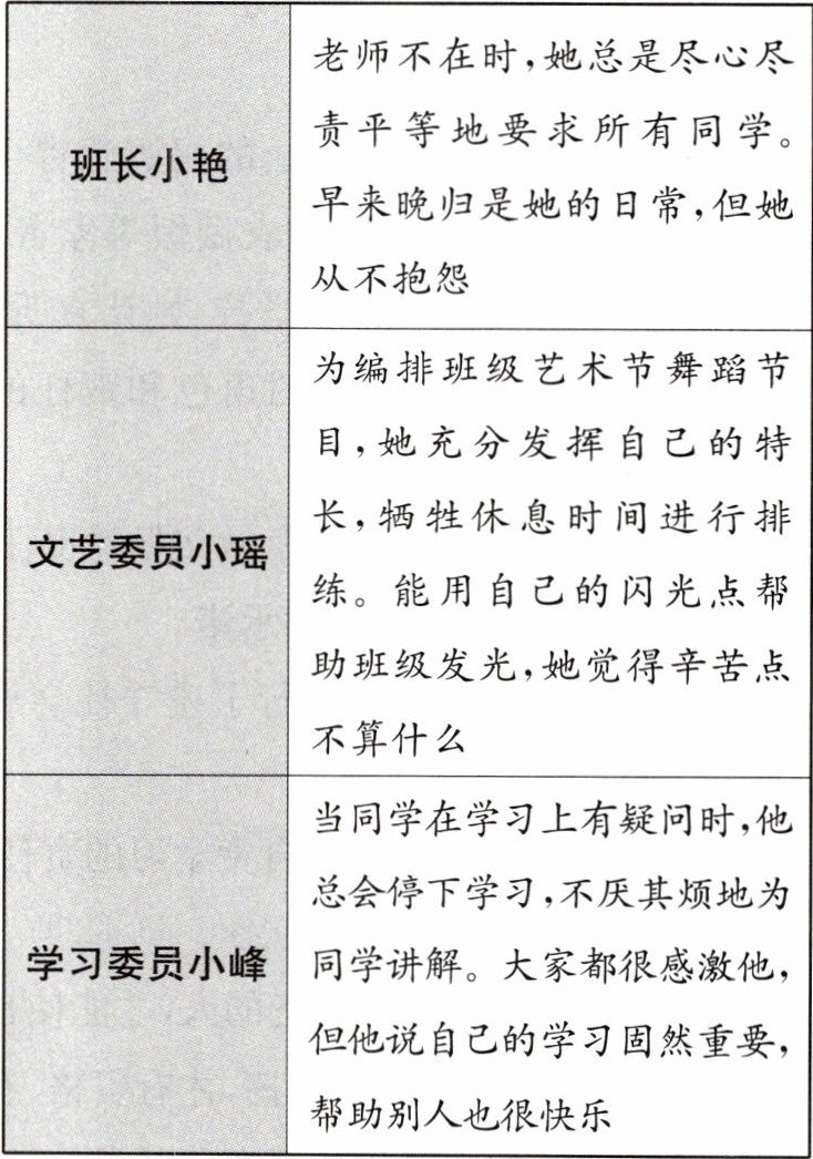 2.中考新形式·宣传标语 学校生活中,每个人都扮演着自己的角色,承担着自己的责任。某校八年级(1)班的同学为表彰班级“主人公”,布置了宣传栏并选取了以下三位榜样班委的事迹。请你为宣传栏设计一条最贴切的标语 (