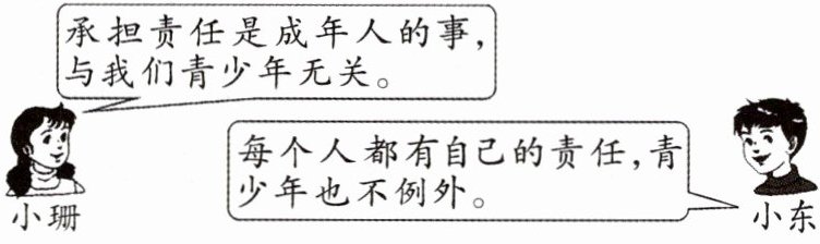 某班就承担责任的话题展开讨论,同学们各抒己见,下面是小珊和小东同学的观点。
