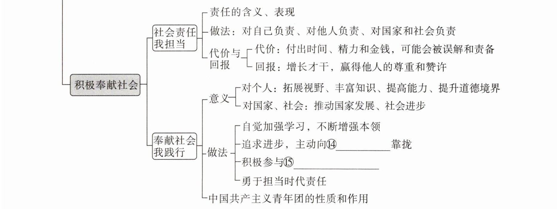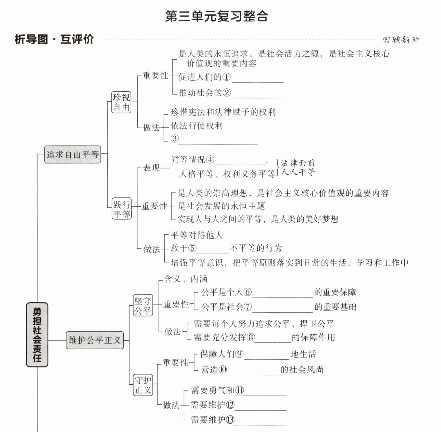 第三单元复习整合 【析导图·互评价】 ①全面发展 ②繁荣进步 ③尊重他人的权利 ④同等对待 ⑤抵制 ⑥生存和发展 ⑦稳定和进步 ⑧规则 ⑨有尊严 ⑩风清气正 ⑪智慧 ⑫司法公正 ⑬国际正义 ⑭团组织 ⑮志愿服务活动