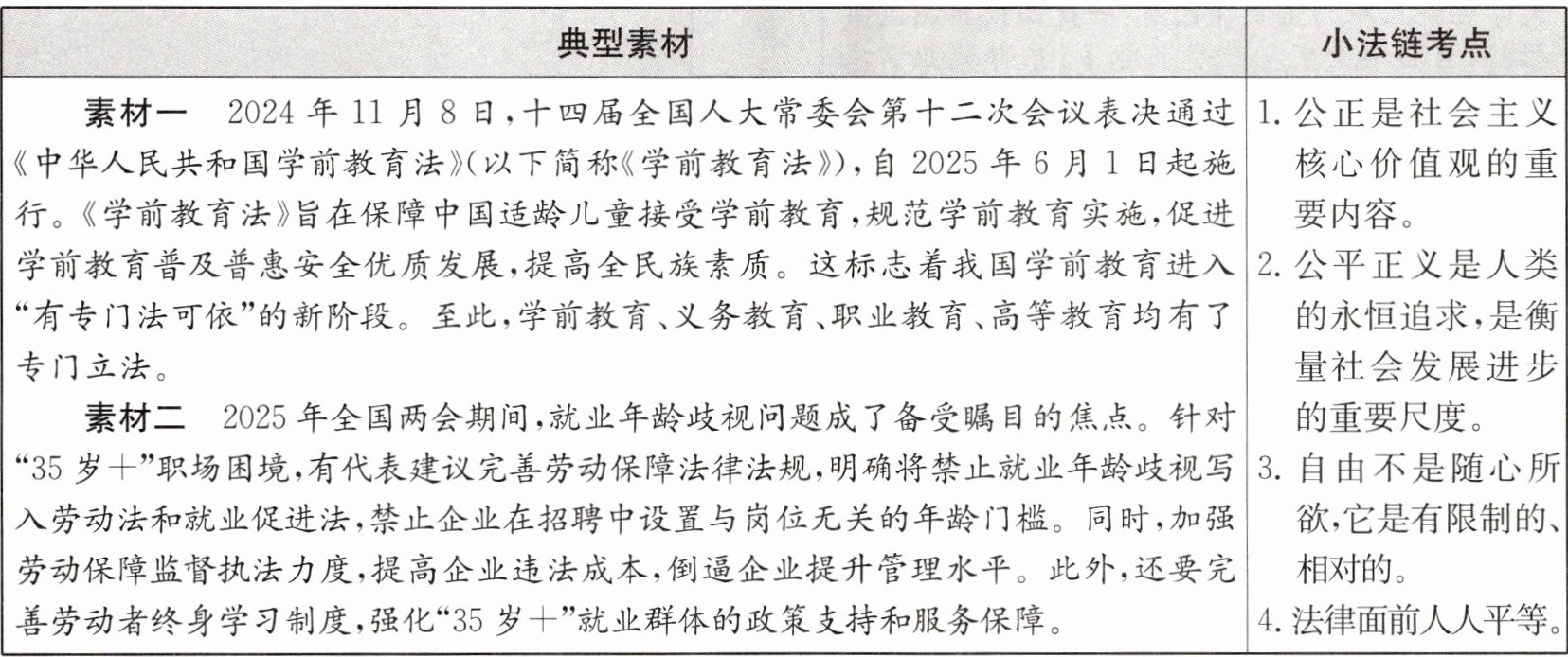 (3)评析类 针对素材二中的现象,有同学认为:“企业有自主招聘的自由,想怎么招人就怎么招人。”请结合自由与平等的有关知识,对该同学的观点进行评析。