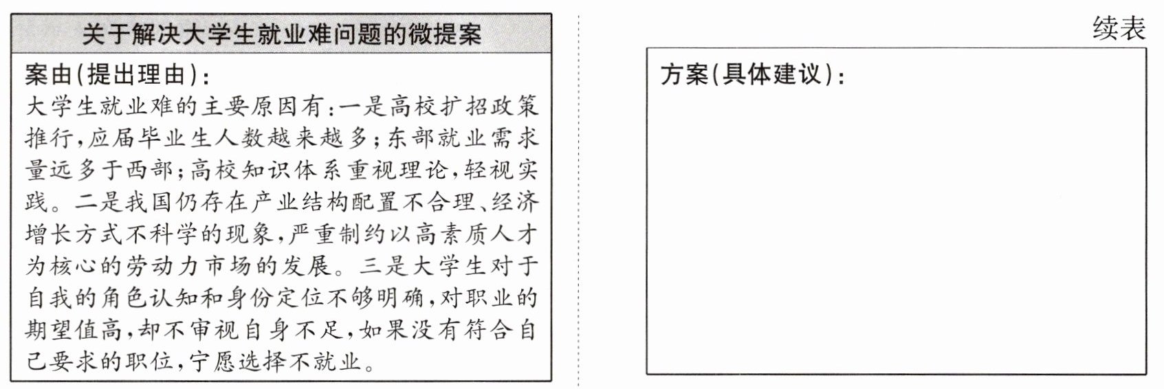 (4)创新设问·微提案 2025年政府工作报告提出:更大力度稳定和扩大就业。八年级(1)班的同学搜集了大学毕业生就业难的主要原因,并向政协委员提出解决大学生就业难问题的微提案。请你将微提案补充完整。(要求:内容表达清晰,学科术语使用规范)