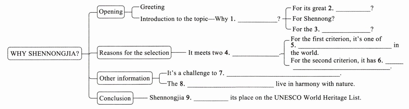 Activity 1 1.Shennongjia 2.forests 3.mysterious creature 4.criteria 5.the most “complete” natural areas 6.incredible biodiversity 7.look after so many species 8.local people 9.deserves
