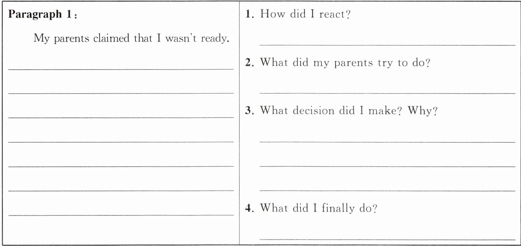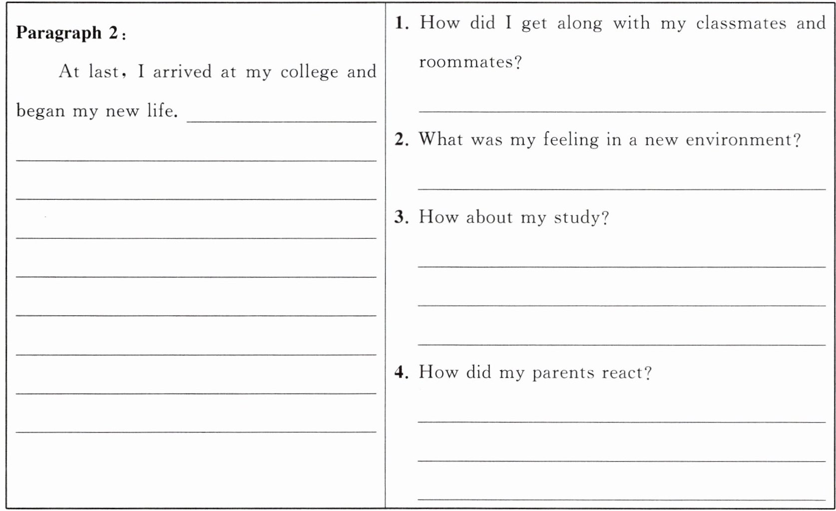 @@Paragraph 1:1. I didn’t give in. I wanted to make my own decision.2. They tried to stop me.3. I was determined to go to China. Because I wanted to be independent and would start fresh, meet new people, and learn about a new place and culture.4. I said goodbye to my parents, leaving for China.Paragraph 2:1. We got on well with each other.2. Everyone in my class was friendly and I was so happy.3. The classes were very interesting and I learned much. I also really loved the culture and everything from China!4. My parents always told me they would come to visit but I wanted to have some time on my own and they did understand that.