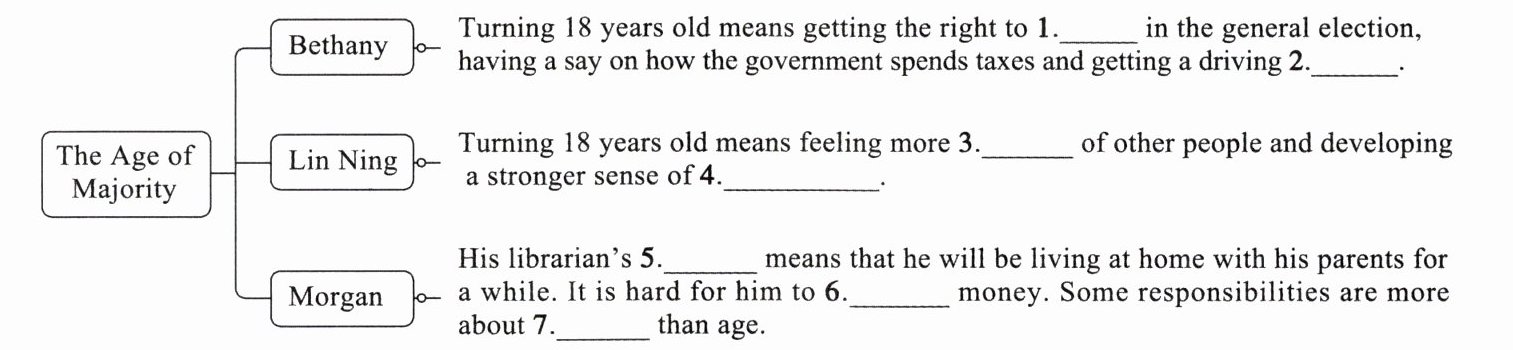 1. vote 2. licence 3. aware 4. social responsibility 5. salary 6. save 7. attitude