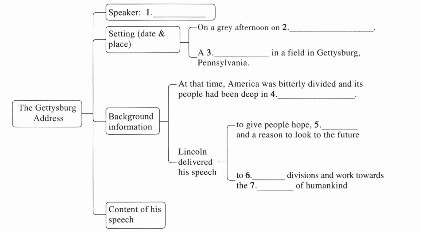 3. It is rather for us to be here dedicated to the great task remaining before us—that from these honored dead we take increased devotion to that cause for which they here gave the last full measure of devotion—that we here highly resolve that these dead shall not have died in vain;that this nation shall have a new birth of freedom;and that this government of the people,by the people,for the people,shall not perish from the earth.