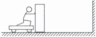 5. 如图所示,假设质量均为 $ m $ 的小车与木箱紧挨着静止在光滑的水平冰面上,质量为 $ 2m $ 的小明站在小车上用力向右迅速推出木箱,木箱相对于冰面的速度为 $ v $,接着木箱与右侧竖直墙壁发生碰撞后以速度 $ v $ 返回被小明接住。求小明接住木箱后三者的共同速度大小。