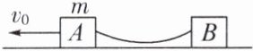 7. 如图所示,光滑水平直轨道上两滑块 $ A $、$ B $ 用橡皮筋连接,滑块 $ A $ 的质量为 $ m $。开始时橡皮筋松弛,滑块 $ B $ 静止,给滑块 $ A $ 一个向左的初速度 $ v_0 $。一段时间后,滑块 $ B $ 与滑块 $ A $ 同向运动发生碰撞并粘在一起。碰撞后的共同速度是碰撞前瞬间滑块 $ A $ 的速度的两倍,也是碰撞前瞬间滑块 $ B $ 的速度的一半。求:
