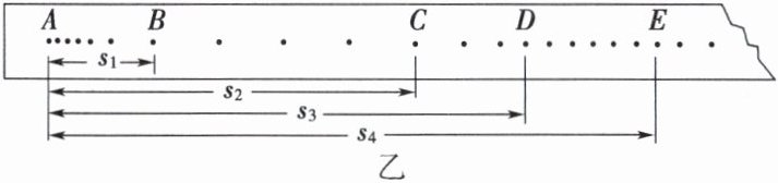 (2)设打点计时器打点时间间隔为T,由图乙所示的纸带可知,碰撞前小车的速度$v=\frac{s_{2}-s_{1}}{4T},$碰撞后两小车的共同速度$v'=\frac{s_{4}-s_{3}}{6T}。$若碰撞前后系统动量守恒,则$m_{1}v=(m_{1}+m_{2})v',$即$m_{1}\frac{s_{2}-s_{1}}{4T}=(m_{1}+m_{2})\frac{s_{4}-s_{3}}{6T},$整理得$\frac{m_{1}(s_{2}-s_{1})}{2}=\frac{(m_{1}+m_{2})(s_{4}-s_{3})}{3}。$