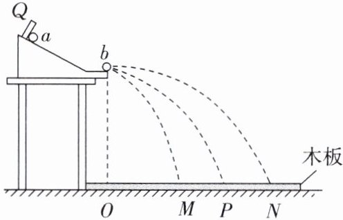 2. 某同学用如图所示的装置验证动量守恒定律,将斜槽轨道固定在水平桌面上,轨道末段水平,右侧端点在水平木板上的垂直投影为 $ O $,木板上叠放着白纸和复写纸。实验时先将小球 $ a $ 从斜槽轨道上 $ Q $ 处由静止释放,$ a $ 从轨道右端水平飞出后落在木板上;重复多次,测出落点的平均位置 $ P $ 与 $ O $ 点的距离 $ x_P $。将与 $ a $ 半径相等的小球 $ b $ 置于轨道右侧端点,再将小球 $ a $ 从 $ Q $ 处由静止释放,两球碰撞后均落在木板上;重复多次,分别测出 $ a $、$ b $ 两球落点的平均位置 $ M $、$ N $ 与 $ O $ 点的距离 $ x_M $、$ x_N $。