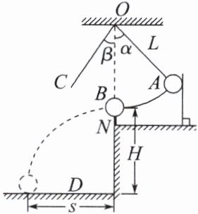 3. 用如图所示的装置来验证动量守恒定律。质量为 $ m_A $ 的钢球 $ A $ 用细线悬挂于 $ O $ 点,质量为 $ m_B $ 的钢球 $ B $ 放在离地面高度为 $ H $ 的小支柱 $ N $ 上,$ O $ 点到 $ A $ 球球心的距离为 $ L $。使细线在 $ A $ 球释放前伸直且线与竖直线的夹角为 $ \alpha $,$ A $ 球释放后摆到最低点时恰与 $ B $ 球正碰,碰撞后,$ A $ 球把轻质指示针 $ OC $ 推到与竖直线的夹角为 $ \beta $ 处,$ B $ 球落到地面上,地面上铺有一张盖有复写纸的白纸 $ D $。保持 $ \alpha $ 角不变,多次重复上述实验,白纸上记录了 $ B $ 球的多个落点。