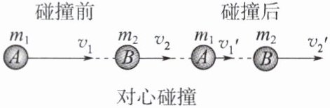 如图所示为两刚性小球$A$、$B$在光滑水平面上发生对心碰撞的情境。小球$A$、$B$的质量分别为$m_1$、$m_2$,碰撞前速度分别为$v_1$、$v_2$,碰撞后速度分别为$v_1'$、$v_2'$。
