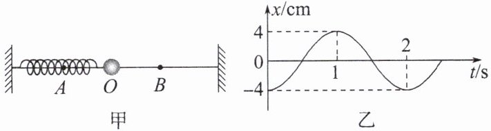 BD 解析:由题图乙可知,小球做简谐运动的周期为2 s,则有$\omega = \frac{2\pi}{T} = \pi rad/s,$则小球的振动方程为$x = -A·\cos\omega t = -4\cos(\pi t) cm,$当t = 0时$x_1 = -4 cm,$当t = 0.25 s时$x_2 = -2\sqrt{2} cm,$设弹簧的劲度系数为k,小球的质量为m,由牛顿第二定律,则有$a_1 = \frac{kx_1}{m},$$a_2 = \frac{kx_2}{m},$则有$a_1 : a_2 = x_1 : x_2 = \sqrt{2} : 1,$小球向右移动的距离为$s = (4 - 2\sqrt{2}) cm < 2 cm,$A、C错误,B、D正确。