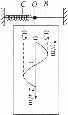 5. (多选)如图所示,在光滑水平杆下面铺一张可沿垂直杆方向匀速移动的白纸,一带有铅笔的弹簧振子在 $ B $、$ C $ 两点间做机械振动(图中铅笔位置在 $ O $ 点),可以在白纸上留下痕迹。已知弹簧的劲度系数为 $ k = 10 \, N/m $,振子的质量为 $ 0.5 \, kg $,白纸的移动速度为 $ 2 \, m/s $,弹簧弹性势能的表达式 $ E_{p} = \frac{1}{2}ky^2 $,不计一切摩擦。在一次弹簧振子实验中得到如图所示的图线,则下列说法正确的是( )