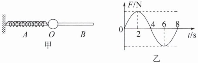 1. 如图甲所示,光滑水平杆上套着一个小球和一个弹簧,弹簧一端固定,另一端连接在小球上,忽略弹簧的质量。小球以 $ O $ 点为平衡位置,在 $ A $、$ B $ 两点之间做往复运动,它所受的回复力 $ F $ 随时间 $ t $ 变化的图像如图乙所示,则在 $ 2 \sim 3 \, s $,振子的动能 $ E_{k} $ 和弹簧的势能 $ E_{p} $ 的变化情况是( )