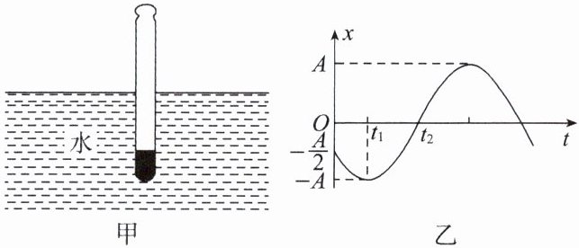 5. 装有一定量液体的玻璃管竖直漂浮在水中,水面足够大,如图甲所示。把玻璃管向下缓慢按压 $ 4 cm $ 后放手,忽略运动阻力,玻璃管的运动可以视为竖直方向的简谐运动,测得振动周期为 $ 0.5 s $。设竖直向上为正方向,某时刻开始计时,其振动图像如图乙所示,其中 $ A $ 为振幅。对于玻璃管,下列说法正确的是( )