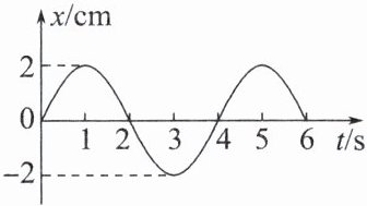 (2)$t=2\ s$时质点位于平衡位置,其速度最大,方向沿$x$轴负方向;$t=5\ s$时质点位于正的最大位移处,其加速度最大,方向沿$x$轴负方向。