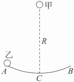 活动 如图所示,$ ACB $ 为光滑弧形槽,弧形槽半径为 $ R $,$ R \gg \overset{\frown}{AB} $,甲球从弧形槽的球心处自由落下,乙球从 $ A $ 点由静止释放,两球可视为质点,重力加速度为 $ g $。问: