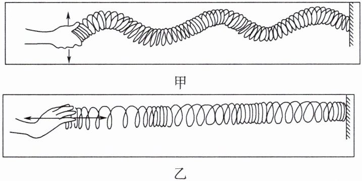 手握轻质弹簧的一端,另一端固定,上下抖动弹簧,弹簧形成凹凸相间的形状,如图甲所示。手握轻质弹簧一端有规律地左右振动,弹簧便形成疏密相间的形状,如图乙所示。