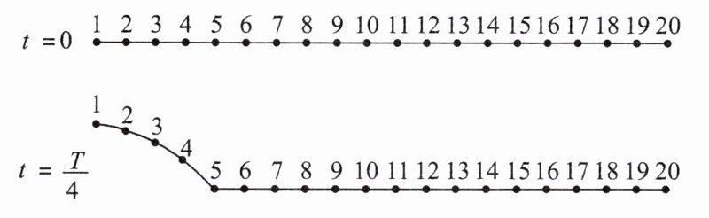 4. 某绳波形成过程的示意图如图所示,质点1在外力作用下沿垂直直线方向做简谐运动,带动其余质点依次上下振动,把振动从绳的左端传到右端。已知t=0时,质点1开始向上运动,t=T/4时,质点1到达最上方,质点5开始向上运动。问: