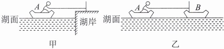 2. 如图所示甲、乙两种情况中,人用相同大小的恒定拉力拉绳子使人和船$A$均向右运动。经过相同的时间$t$,图甲中船$A$没有靠岸,图乙中船$A$没有与船$B$相碰,则经过时间$t$( )