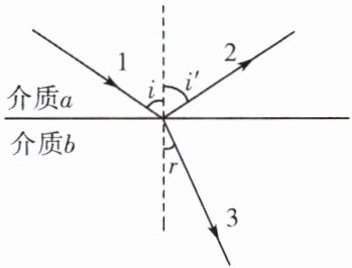 3.D 解析:波1、2都在介质a中传播,故1、2的频率、波速、波长均相等,A、B错误;波1、3是在两种不同介质中传播,波速不同,但波源没变,因而频率相等,由$\lambda = \frac{v}{f}$得波长不同,故C错误,D正确。