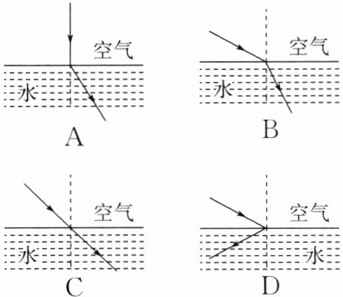 1.B 解析:题图A中光线从空气垂直水面射入水里,入射角为零,折射角也应为零,A错误。题图B中光线从空气斜射入水里,传播方向发生改变,折射光线与入射光线分别位于法线两侧,符合折射定律,B正确。题图C中光线从空气斜射入水里,传播方向没有发生改变,不符合折射定律,C错误。题图D中光线从空气斜射入水里,折射光线与入射光线位于法线的同一侧,不符合折射定律,D错误。