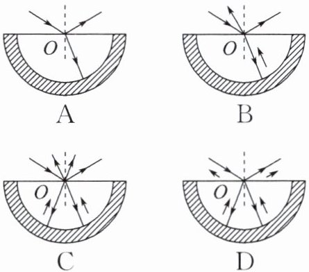 2.D 解析:光线在圆心处发生折射和反射,折射光线与半圆表面垂直,到达半圆表面后沿原路返回,返回至空气与玻璃的交界处时再次发生反射和折射,折射光路遵循光路可逆原理,D正确。
