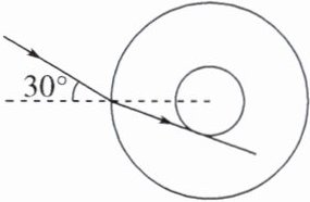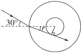 如图为一用透明材料做成的空心球体,其中空心部分半径与球的半径之比为1:3。当细光束以30°的入射角射入球中,其折射光线刚好与内壁相切,则该透明材料的折射率为( )