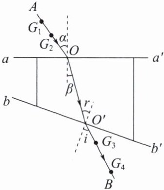 2. 实验原理:如图所示,$ abcd $ 为一个两面平行的玻璃砖,入射角为 $ i $,折射角为 $ r $,根据 $ n = \frac{\sin i}{\sin r} $ 计算出玻璃的折射率。大头针 $ G_1 $、$ G_2 $ 确定入射光线,大头针 $ G_3 $、$ G_4 $ 确定出射光线,最终 $ G_4 $ 应当挡住______及______的像。