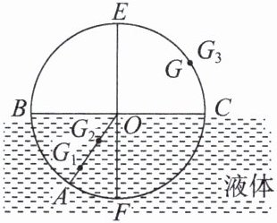 5. 某校开展研究性学习,某物理小组根据光学知识,设计了一个测定液体折射率的仪器,如图所示。在一个圆盘上,过其圆心 $ O $ 作两条相互垂直的直径 $ BC $、$ EF $。在半径 $ OA $ 上,垂直盘面插上两枚大头针 $ G_1 $、$ G_2 $ 并保持位置不变。每次测量时让圆盘的下半部分竖直浸入液体中,而且总使得液面与直径 $ BC $ 相平,$ EF $ 作为界面的法线,而后在图中右上方区域观察 $ G_1 $、$ G_2 $,通过插上大头针 $ G_3 $ 来同时遮住水中大头针 $ G_1 $、$ G_2 $ 的像。同学们通过计算,预先在圆周 $ EC $ 部分刻好了不同角度对应的折射率的值,这样只要根据 $ G_3 $ 所插的位置 $ G $,就可以直接读出液体折射率的值。