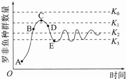 3. 某实验基地水库中放养了一批罗非鱼,监测数据显示,罗非鱼的种群数量在A~E段发生了明显波动(如图所示)。调查发现有人在该水库放生了大型肉食性鱼类。一段时间后,罗非鱼种群数量达到了相对稳定状态。下列叙述错误的是( )