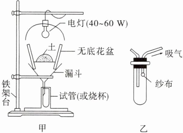 (1)甲装置的花盆壁和放在其中的土壤之间留一定空隙的目的是便于空气流通。甲装置主要是利用土壤小动物避光、避高温、趋湿的习性采集。