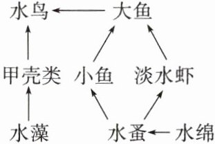 $\begin{matrix}水鸟&大鱼\\\uparrow&\uparrow\\甲壳类&小鱼&淡水虾\\\uparrow&\uparrow&\uparrow\\水藻&水蚤&水绵\end{matrix}$