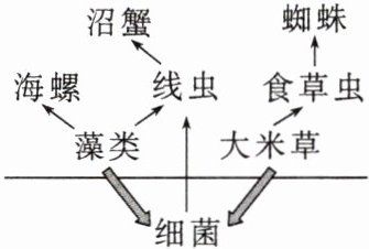3.B 解析:细菌既可作为分解者,又可作为消费者(如线虫)的食物,A 正确;食物链的起点是生产者,海螺、线虫和食草虫均能以生产者为食,故三者应为第二营养级,B 错误;大米草与藻类之间存在种间竞争关系,大米草大量死亡会导致藻类数量增多,藻类数量增多会导致线虫数量增多,进而导致以线虫为食的沼蟹数量增多,C 正确;杀虫剂杀死食草虫,会导致蜘蛛的食物减少,进而导致蜘蛛数量减少,D 正确。