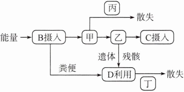 D 解析:摄入量=同化量十粪便中的能量,故题图中的甲表示B的同化;同化量=呼吸作用散失的能量十用于生长、发育和繁殖的能量,故乙表示B生长、发育和繁殖,A正确。参与丁(分解者分解作用)过程的都是异养型生物,包括大多数细菌、真菌等,B正确。能量通过呼吸作用散失,故丙表示呼吸作用,C正确。题图中D的能量不全部来自B生物,还来自A生物(B粪便中的能量,是B未同化的能量,仍属于其上一个营养级A的同化量),D错误。