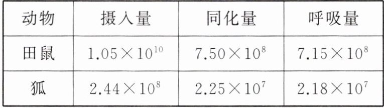 1. 科研人员对某草原生态系统中“草→田鼠→狐”食物链及其能量流动进行了研究,其中草固定的太阳能为 $ 2.45×10^{11} J·hm^{-2}·a^{-1} $,田鼠和狐的各项能量值测量结果如下表所示(单位:$ J·hm^{-2}·a^{-1} $)。下列说法中错误的是( )