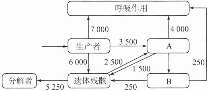 B 解析:题图中A和B粪便中的能量被分解者利用,主要是借助分解者的呼吸作用分解粪便中的有机物,该过程中能量绝大多数以热能形式散失,A正确;根据同化量=呼吸散失的能量十用于生长、发育和繁殖的能量可计算出,A用于生长、发育和繁殖的能量=3500+2500-4000=2000J/(m².a),B错误;由A到B的能量传递效率=B同化量/A同化量×100%,A同化量=3500+2500=6000J/(m².a),B的同化量=A同化量一呼吸作用一流向分解者=3500+2500−4000−1500=500J/(m².a),所以由A到B的能量传递效率为500÷6000×100%≈8.3%,C正确;该海水立体养殖模式表层养殖海带等大型藻类,海带下面挂笼养殖滤食小型浮游植物的牡蛎,底层养殖以底栖微藻、生物遗体残骸等为食的海参,在时间、空间上进行合理配置,可增大流入该生态系统的总能量,提高了能量利用率,D正确。