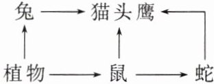 (2) 若植物有 $ 2/5 $ 被兔所食,有 $ 3/5 $ 被鼠所食,鼠有 $ 2/3 $ 直接被猫头鹰捕食,有 $ 1/3 $ 被蛇捕食,那么,猫头鹰若要增加 $ 20 g $ 体重,最少需要消耗的植物为______(精确到个位数)$ g $。