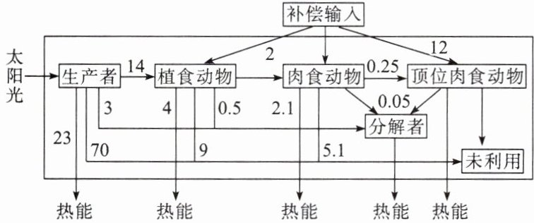 (2) 流入该生态系统的总能量是______ $ kJ·m^{-2}·a^{-1} $,用于植食性动物自身生长、发育和繁殖等生命活动的能量是______ $ kJ·m^{-2}·a^{-1} $。