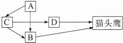 C 解析:分析题图可知,图中有3条食物链,即A→B→猫头鹰、A→C→B→猫头鹰、A→C→D→猫头鹰。题中所问为猫头鹰体重每增加1kg,至少消耗的A的质量,已知高营养级的能量求低营养级能量时,需最少能量,应选最短食物链,能量传递效率按20%计算。所以选最短食物链(A→B→猫头鹰),能量传递效率按20%计算,则至少消耗A的质量为1÷20%÷20%=25kg,C正确。