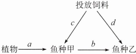 B.鱼种甲和鱼种乙间的能量传递效率为 $ (b + d)/(a + c) $