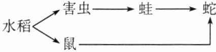 13. 下图是一个农田生态系统中的两条主要的食物链。如果蛇的食物 $ 1/2 $ 来自鼠,$ 1/2 $ 来自蛙,而能量的传递效率为 $ 10\% $,那么蛇每同化 $ 1 kJ $ 的能量,需消耗水稻的能量为( )