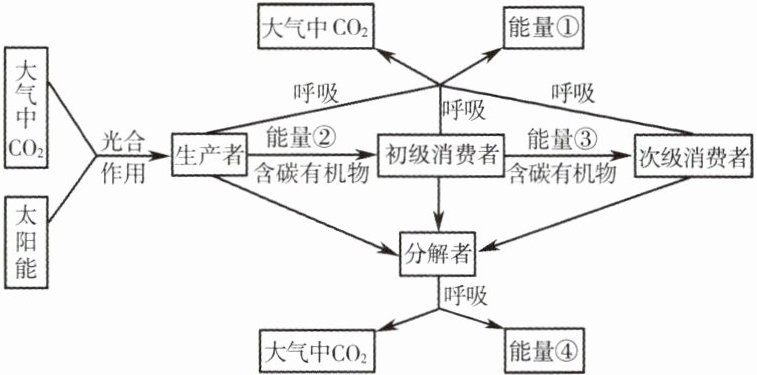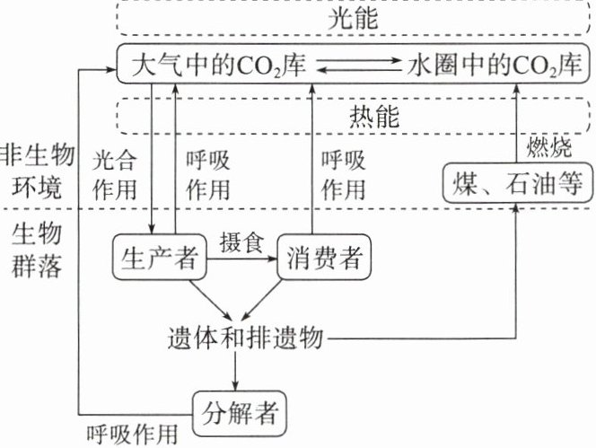 2. 请在碳循环过程模型上用虚线绘制能量流动过程。