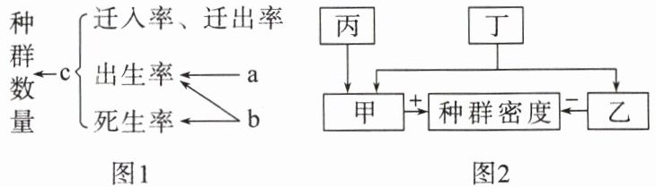 C 解析:题图1中a只影响出生率,而b既影响出生率也影响死亡率,从而判断出a为性别比例,b为年龄结构,进而可知c为种群密度。题图2为题图1的变式,题图2中甲使种群密度增加,应为出生率;乙使种群密度减小,应为死亡率;丙只影响出生率,应为性别比例;丁为年龄结构。题图1中b(年龄结构)是预测种群数量未来变化趋势的主要依据,A正确;题图1中c为种群密度,是种群最基本的数量特征,B正确;题图2中丁为年龄结构,而题图1中a为性别比例,C错误;题图2中丙为性别比例,主要通过影响出生率来间接影响种群密度,D正确。