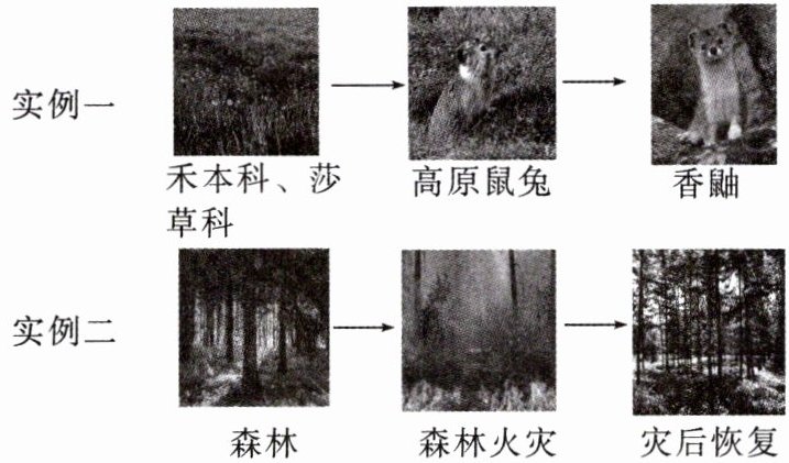 2. 尝试用文字、线框和箭头,简要描绘高原鼠兔的数量能够维持相对稳定的原因和森林火灾多发的原因及灾后恢复的过程。
