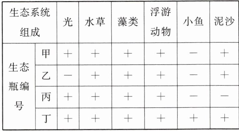 1. 甲、乙、丙、丁 4 个透明的生态瓶,各瓶内的组成和条件见表。经过一段时间的培养和观测后,发现甲瓶是最稳定的生态系统。下列有关叙述错误的是( )