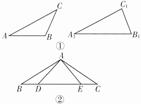 11. 【几何直观,推理能力】[2024遂宁改编]如图①,△ABC与△A₁B₁C₁满足∠A=∠A₁,AC=A₁C₁,BC=B₁C₁,∠C≠∠C₁,我们称这样的两个三角形为“伪全等三角形”. 如图②,在△ABC中,AB=AC,∠B=∠C,点D,E在线段BC上,且BE=CD,则图中“伪全等三角形”共有(
