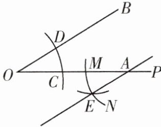 ①取射线OP上的点C,以点O为圆心,OC长为半径画弧,交OB于点D;