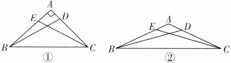 (2)如图②,在△ABC中,∠BAC为钝角,AB=AC,点D,E分别在边AC,AB上。若CE=BD,则线段AE和线段AD相等吗?如果相等,请给出证明;如果不相等,请说明理由。