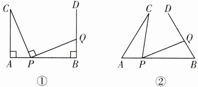 (2) 如图②,将“$CA \perp AB$,$DB \perp AB$”改为“$\angle A = \angle B = \alpha$($\alpha$为锐角)”。若$\angle CPQ = \alpha$,$CP = PQ$,判断(1)中的数量关系是否会改变?并说明理由。